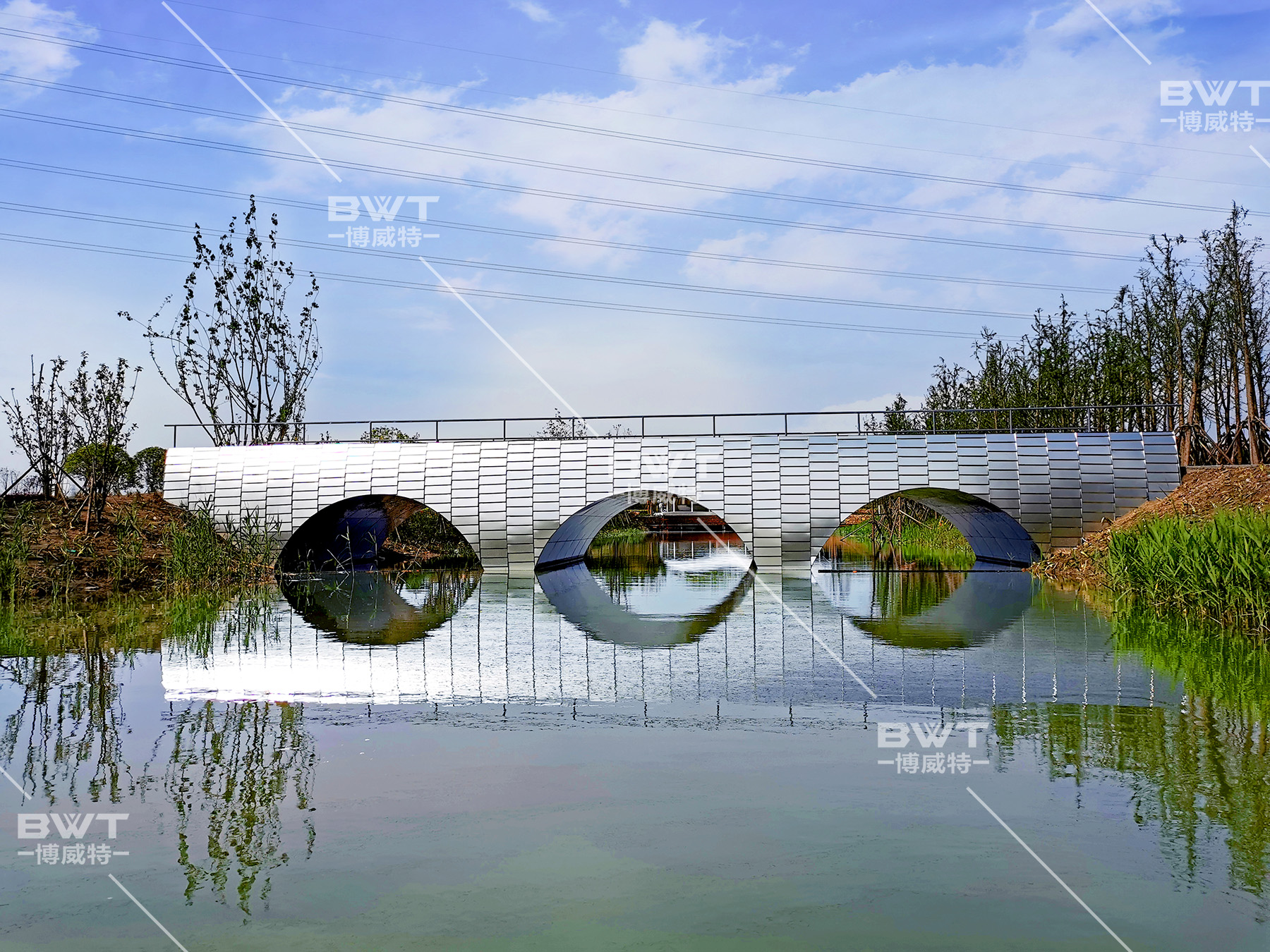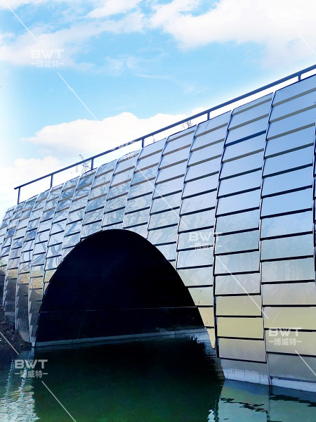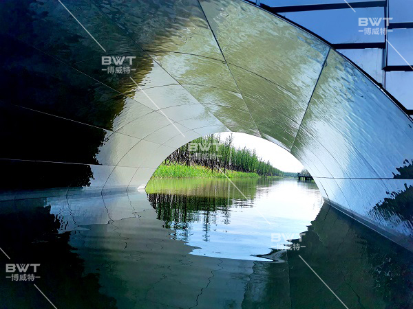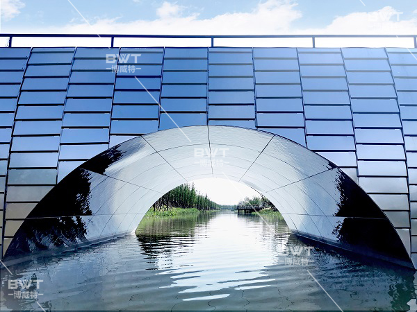 静跟动的结合,使用水波纹不锈钢镜面材质生动地表现出来,别开生面地呈现一片水光潋滟之景,桥洞水波纹纹理好似风动泛起的涟漪,让我们不禁要问此刻入眼帘的究竟是镜面还是水面。